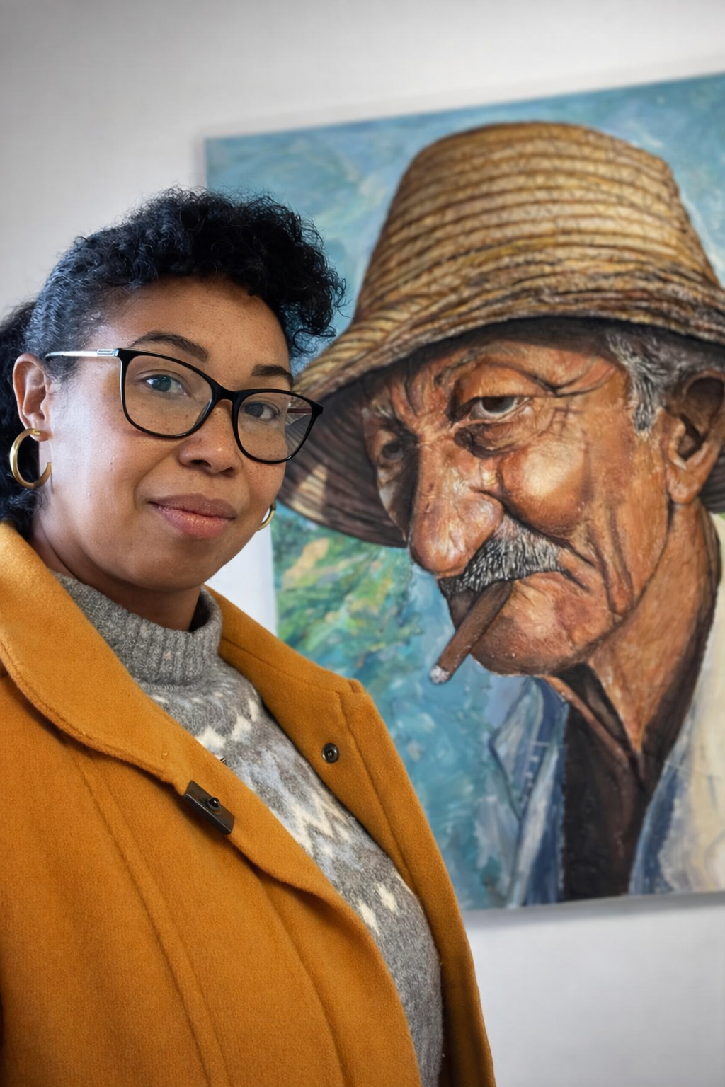 Meiling Alvarez Marquez à côté d'une de ses toiles "Guajiro" technique mixte sur toile